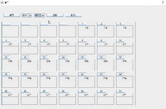 자바(Swing) - 달력 구현하기 자바(Swing) - 달력 구현하기 자바(Swing)으로 달력 구현하는 방법에 대해서 소개하겠습니다. 1. 자바 달력 만들기 작성 소요 기간: 2017-10-27 ~ 2017-10-28일 1일: 3시간~7시간 2일: 5시간 자바 - 스윙(Swing) 달력 완성 2. UI 디자인 설명) 보라색, 초록색으로 표기한 것은 고정된 영역이고, 파란색과 빨강.. 공부/자바(JAVA) 2017.10.28